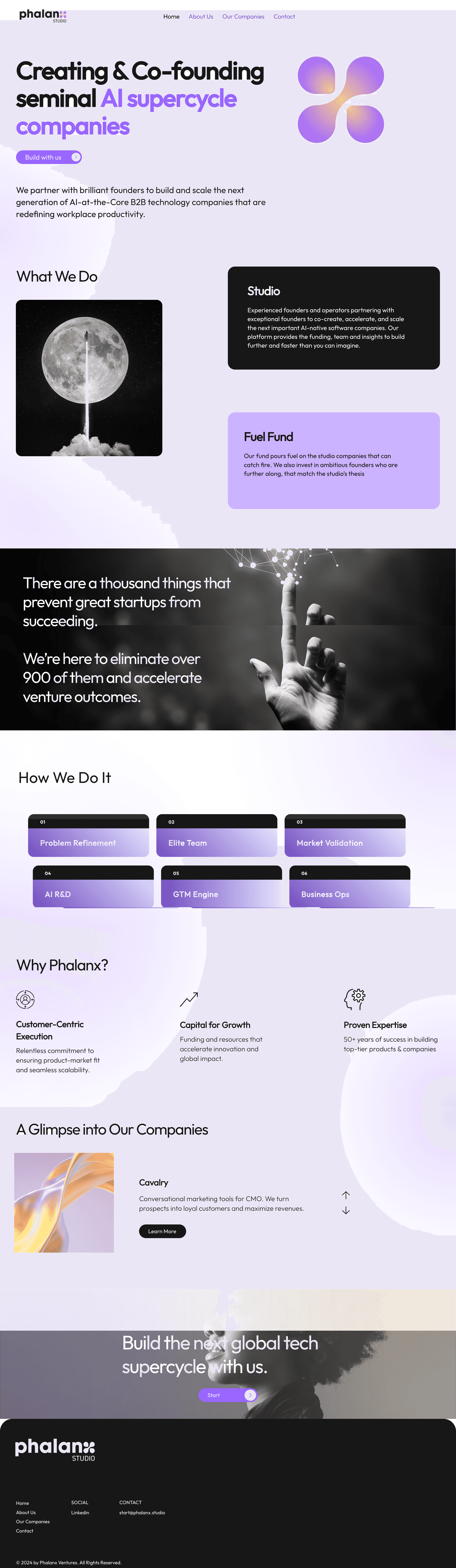 Working closely with a designer and motion artist, I shaped the brand voice, wrote all content, directed UX and design, and produced assets to position Phalanx competitively among top-tier venture studios.